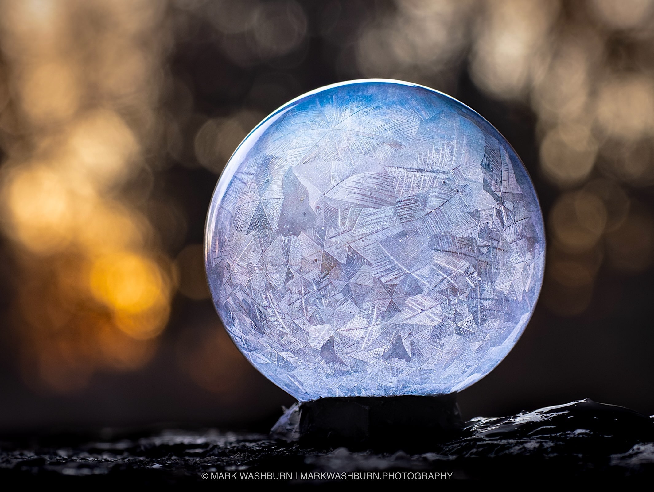Usually the calmest time of day is near dawn…and it just so happens the sunrise makes for a nice backdrop for a frozen bubble. This one wiggled a little bit early on…with just a hint of wind now and then…but once it froze up, it became quite stable for photographs.